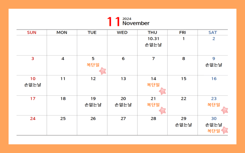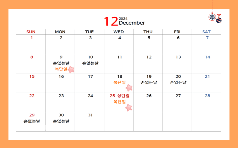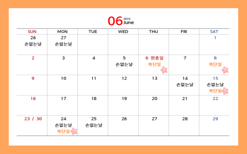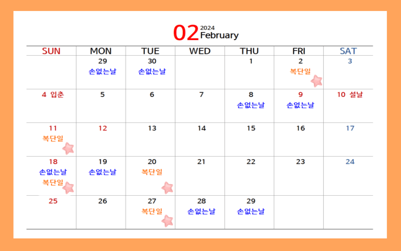 손없는 날은 음력을 기준으로 하며, 끝자리가 0 과 9로 끝나는 날입니다. 복단일 또한 음력으로 확인해야 하는 번거로움이 있지만 아래 2024년 달력 1월부터 12월까지 ★표시로 복단일을 표시해 두었으니 집안에 대소사를 계획하고 있다면 택일하기 전 복단일과 손없는 날은 반드시 체크해 보는 것이 좋겠습니다.
